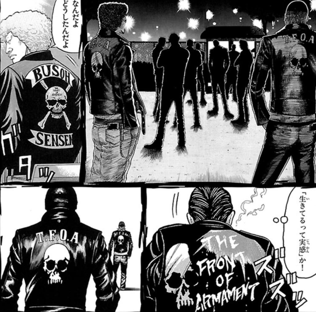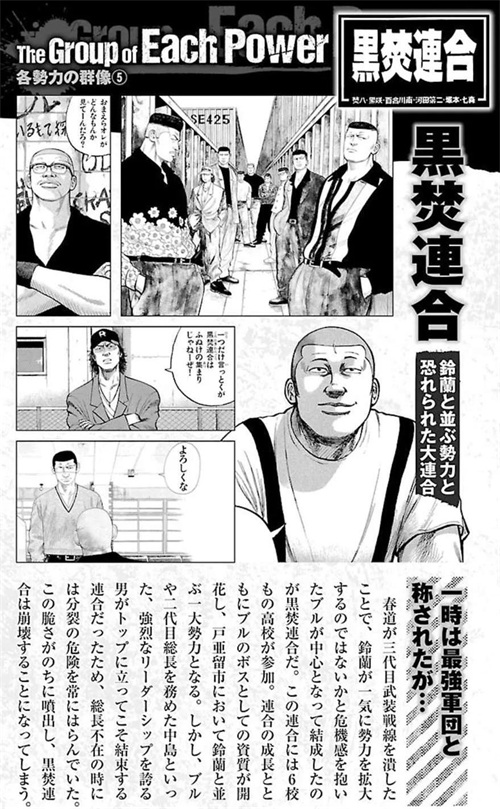 而黑焚联合的总长布鲁,凭借出色的实力,和铃兰的坊屋春道、凤仙的美藤龙也、武装战线的九能龙信并称为“四大天王”。