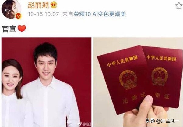 2018年10月16日,赵丽颖突然在个人社交账号上发布了一组结婚照片,官宣和冯绍峰结婚。