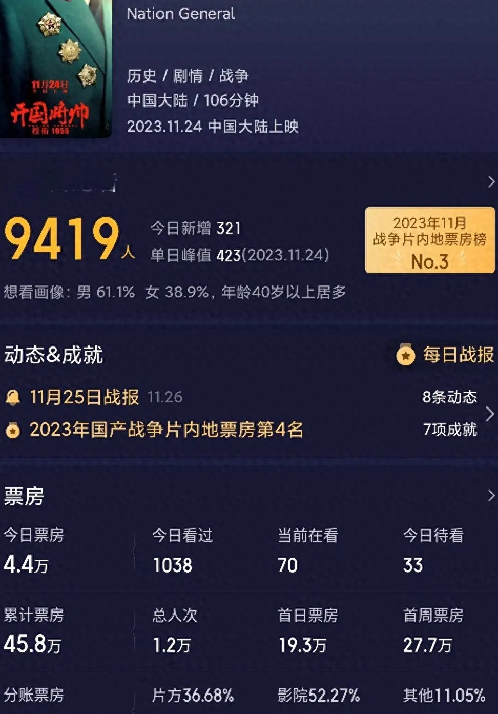 唐国强独自执导的新电影《开国将帅授衔1955》于11月24日盛大上映,截至发稿时,票房仅为不足50万元,这一成绩着实令人称奇。虽然这部电影汇聚了李晨、秦海璐、吕良伟、谢孟伟等一群实力派演员,但在短短的四天内未能取得理想的票房战绩,着实令人大跌眼镜。