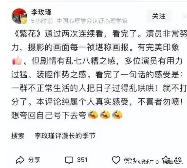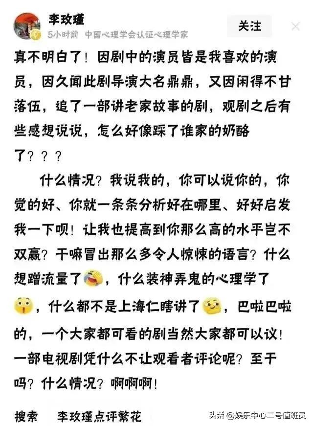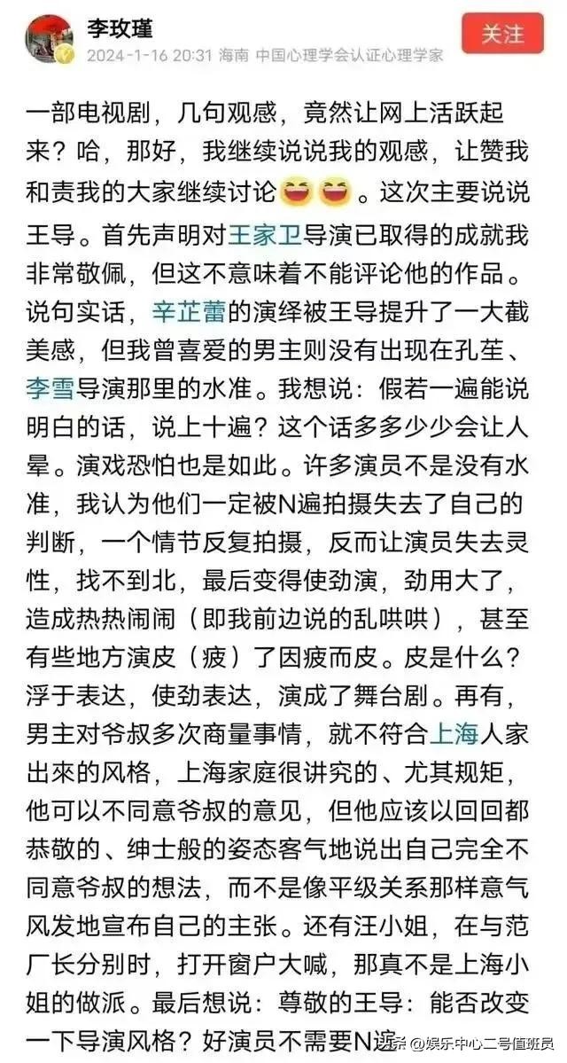 首先,作为心理学家,李玫瑾有权对电视剧《繁花》发表自己的看法和评价。每个人的观点和认知都受到其个人经历、教育背景、专业领域等多种因素的影响。李玫瑾作为一位心理学家,她的观点可能基于她的专业知识和研究背景。她的批评主要针对剧情混乱、演员用力过猛等问题,这也是一个普通观众可能会有的观感。她的观点引发了网友的热议,这说明每个人都有自己的审美标准,对作品的理解和感受也会有所不同。