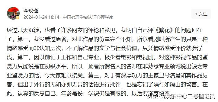关于李玫瑾批评《繁花》被网暴、最终删文向王家卫道歉的事件,我认为这是一个涉及到审美差异和言论自由的问题。