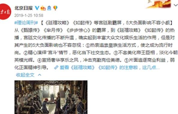 这其实就是背后的官方在整顿,北京日报明确表示了下架如懿传的原因。分别是热衷追崇皇族生活方式,使之成为流行时尚;精心演绎“宫斗”情节,恶化当下社交生态;不吝美化帝王臣相,淡化今朝英模光辉;宣扬奢华享乐之风,冲击克勤克俭美德;片面追逐商业利益,弱化正面精神引导。