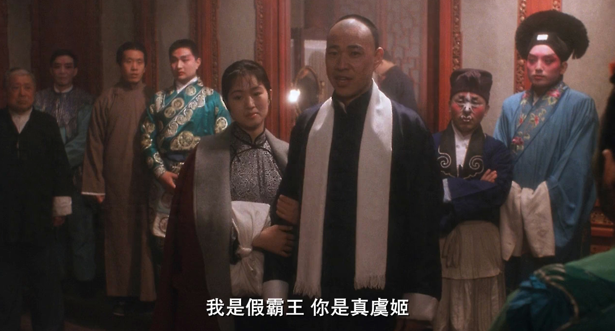 小豆子完成了由男儿郎到女娇娥的转变,来到张公公府上第一次演出“虞姬”,唱出了本片的主题唱词:“自从我随大王东征西战,受风霜与劳碌年复年年……恨只恨无道秦把生灵涂炭……”此时的唱词既涵尽了小豆了练戏的辛酸,也第一次强制性地将本片主题唱词《霸王别姬》的内容灌输给了观众。