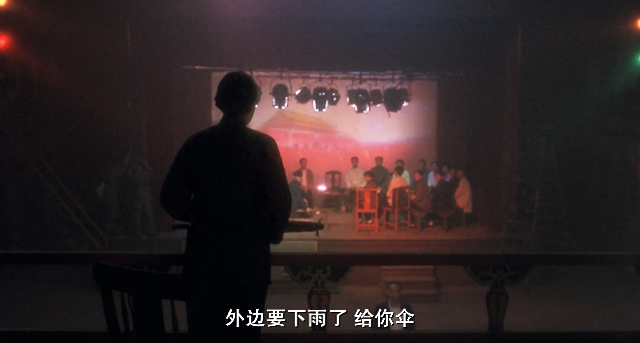 伞出现在讨论戏剧改革的一幕中,程蝶衣坚持着自己对京剧艺术的认识,段小楼有心附和,刚要讲话,菊仙发出一声高喊,并从看台上掷给了他一柄红伞,还说外面要下雨了。菊仙的这番努力没有白费,段小楼回到戏台上便说出了一番违心的言词。菊仙又一次拯救了段小楼,但同时也将他推向背叛之路,在这里,“伞”无疑具有“保护伞”的含义,是一个关于躲避政治风雨的符号。