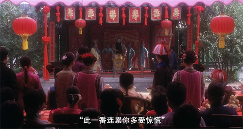 日本兵占领北平,程蝶衣为他们唱的是《贵妃醉酒》一段,其中的重点唱词是:“……啐,哪个与你通宵?”而在此之前的一段戏是菊仙和段小楼的结婚大典。这句唱词恰到好处地象征了程蝶衣难与段小楼、菊仙共处的心境——“人生在世入春梦,且自开怀饮几盅。”