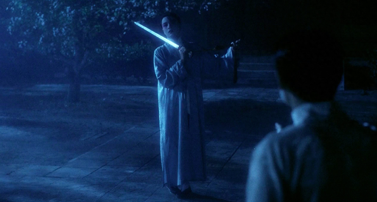 剑第三次出现是日本人占了北平后。段小楼因为弃唱玩蛐蛐而变得心情异常烦躁.这时,菊仙告诉他,关师傅要见他,他一听,表面上说无脸见师傅,内心里却是无比兴奋,于是拿出剑来舞了一通,他知道师傅找他是让他继续回到戏中,