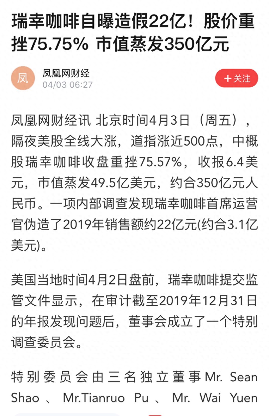 然而,瑞幸咖啡最近的大火,却是因为先是在4月2日“自曝”公司2019年编造虚假交易额22亿元。