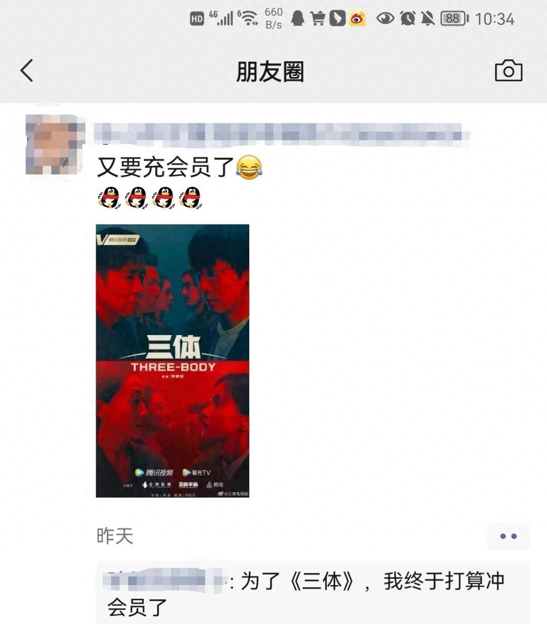 在《三体》剧集发布预告片后,一位磁铁在朋友圈配上海报并宣称:又要充会员了。另一位号称从不开会员看剧的磁铁留言:为了《三体》,我终于打算充会员了。