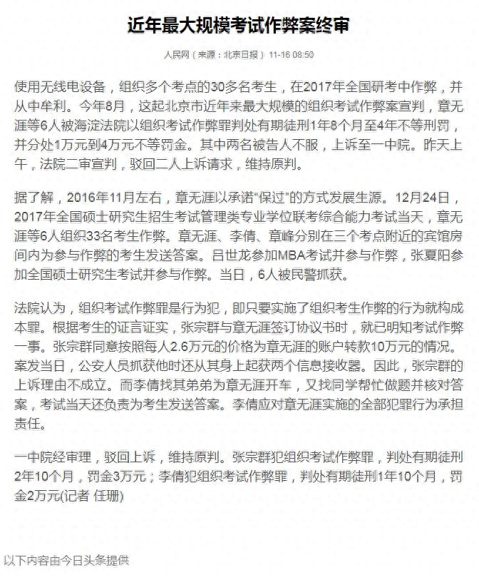 今日头条新闻《今年最大规模考试作弊案终审,维持原判》
