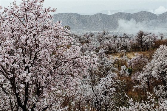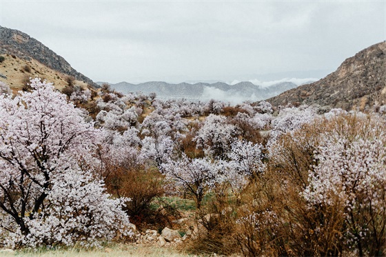 从设拉子温暖的谷地驱车出发,一路风景变幻,让人着迷,从沙漠绿洲到戈壁荒野再到高山草甸,蜿蜒盘旋的道路带着我们在巍峨的札格罗斯山脉中穿行,一路落差极大,更让我在这刀削斧劈的山峰之间,邂逅一片满山满谷的桃花树林!如粉云般的桃花,撒满了整个山坡,云雾在侧,远眺雪峰如盖,有种张无忌找到九阳真经时的魔幻感觉。