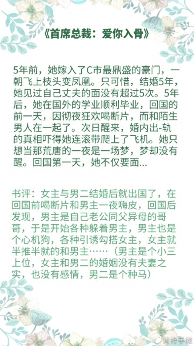 3总裁文的魅力在于,它虽然狗血,但还是欲罢不能啊(//∇//),吐血整理出三本有肉有剧情的男小三上位总裁文,作者文笔也是棒棒哒!!!喜欢的别错过哦~