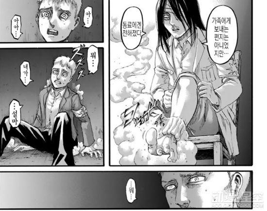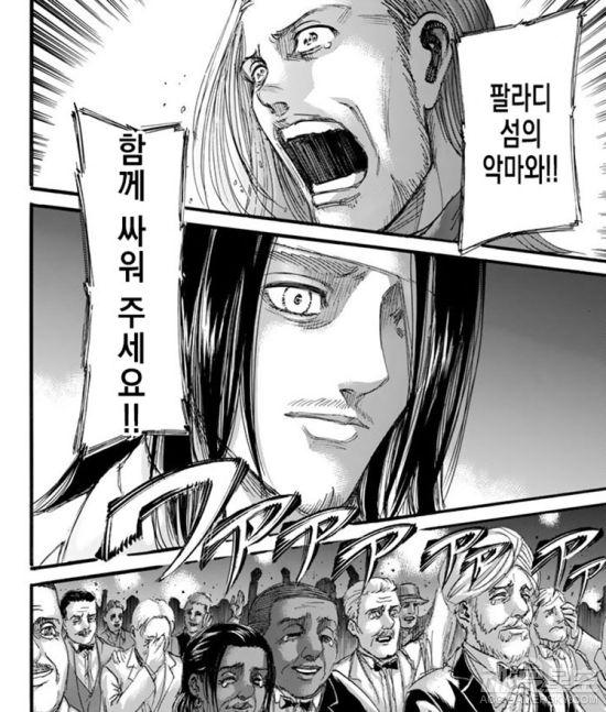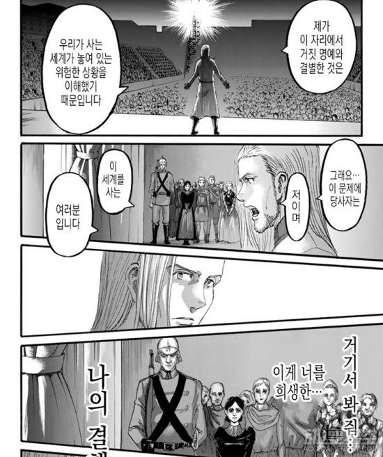 莱纳被艾伦留了下来,他向莱纳和马尔科展示了自己的巨人之力,感觉这个孩子已经吓坏了。莱纳请求艾伦不要在这里发动,艾伦表示“我会继续前进 直到将敌人驱逐为止”。而“战锤巨人”还在台上做着激情演讲,在他爆发之时,艾伦也变身为巨人,并且将他抛向了天空。
