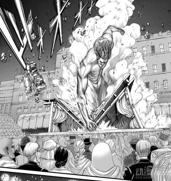 《进击的巨人》漫画100话的图透终于来了,果然在这一话艾伦有了大动作,他直接在将演台的下面变身成“进击的巨人”,对马雷帝国开战。而且貌似这个正在演讲的战锤巨人有些问题,还没做出什么大动作就直接被艾伦给撕了?