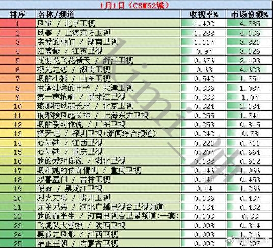 2018年1月1日(周一)电视剧收视率排行榜 csm52城 风筝、亲爱的她们、红蔷薇、花谢花飞花满天、极光之恋、我的小姨、生逢灿烂的日子、第一声枪响、琅琊榜风起长林、我的爱对你说、择天记、心如铁