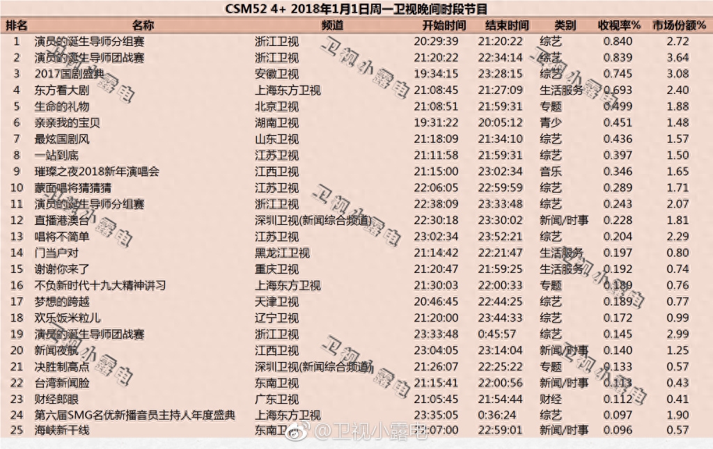 2018年1月1日(周一)综艺节目收视率排行榜 csm52 省级卫视 晚间节目收视率#演员的诞生导师分组赛##演员的诞生导师团战赛##2017国剧盛典##东方看大剧##生命的礼物##亲亲我的宝贝##最炫国剧风##一站到底##璀璨之夜2018新年演唱会##蒙面唱将猜猜猜#