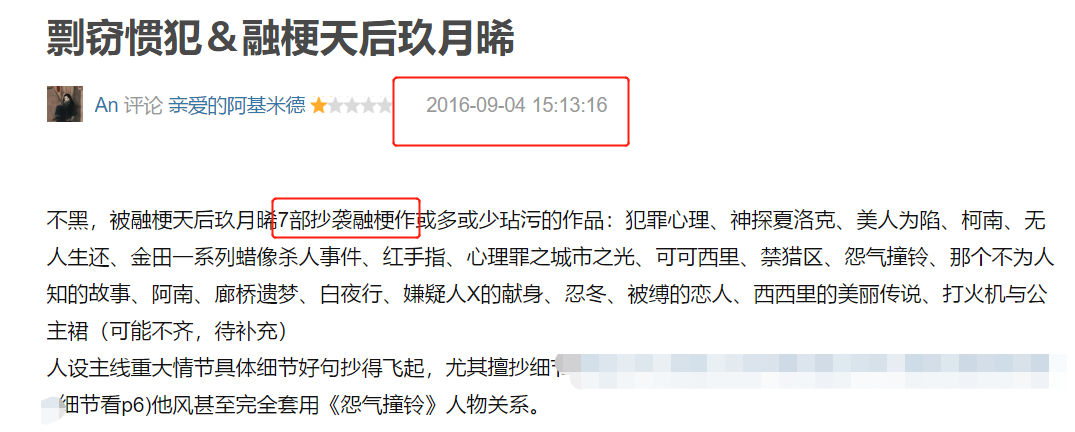 ▼ 2016年就有网友指出她作品中的融梗情节,在书评中详细的指出她涉嫌抄袭的细节;