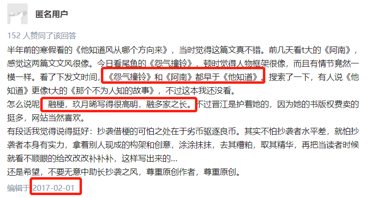 她作品涉嫌融梗的地方无数,看过的读者大多都认为,人的情绪或许是共通的,但绝不可能做到作品的关键情节全都和热门作品一模一样;