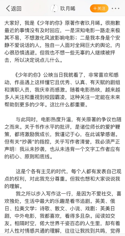 《少年的你》上映十天内地票房突破11亿元,在原著融梗风波传到日本后,该电影原著作者玖月晞针对此事也终于有了回应。