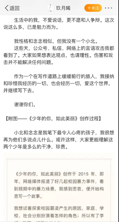 随后,玖月晞还回应了大家对她作品涉嫌抄袭的指控,称自己“从未抄袭,也从未违背一个文字工作者应有的初心、原则和底线。”一句“独自一人面对全网巨大的舆论,内心很恐惧逃避”疑似暗示网友,自己正在遭受网络暴力。