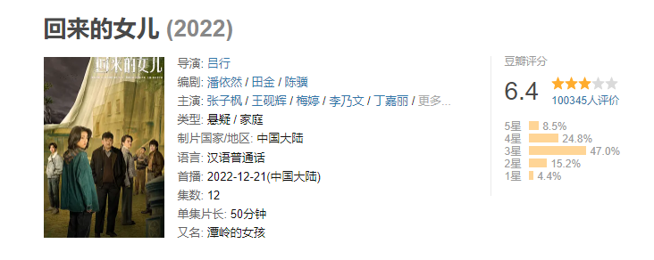 《回来的女儿》这部剧作为2022年最后一部悬疑剧,终究还是走了下线,没能保住2022年悬疑剧的“尊严”。虽然这部剧在豆瓣评分只达到了6.4的评分,但综合剧情、演员的演技等问题,评分还是略低了,7.8分应该还是没有问题的。