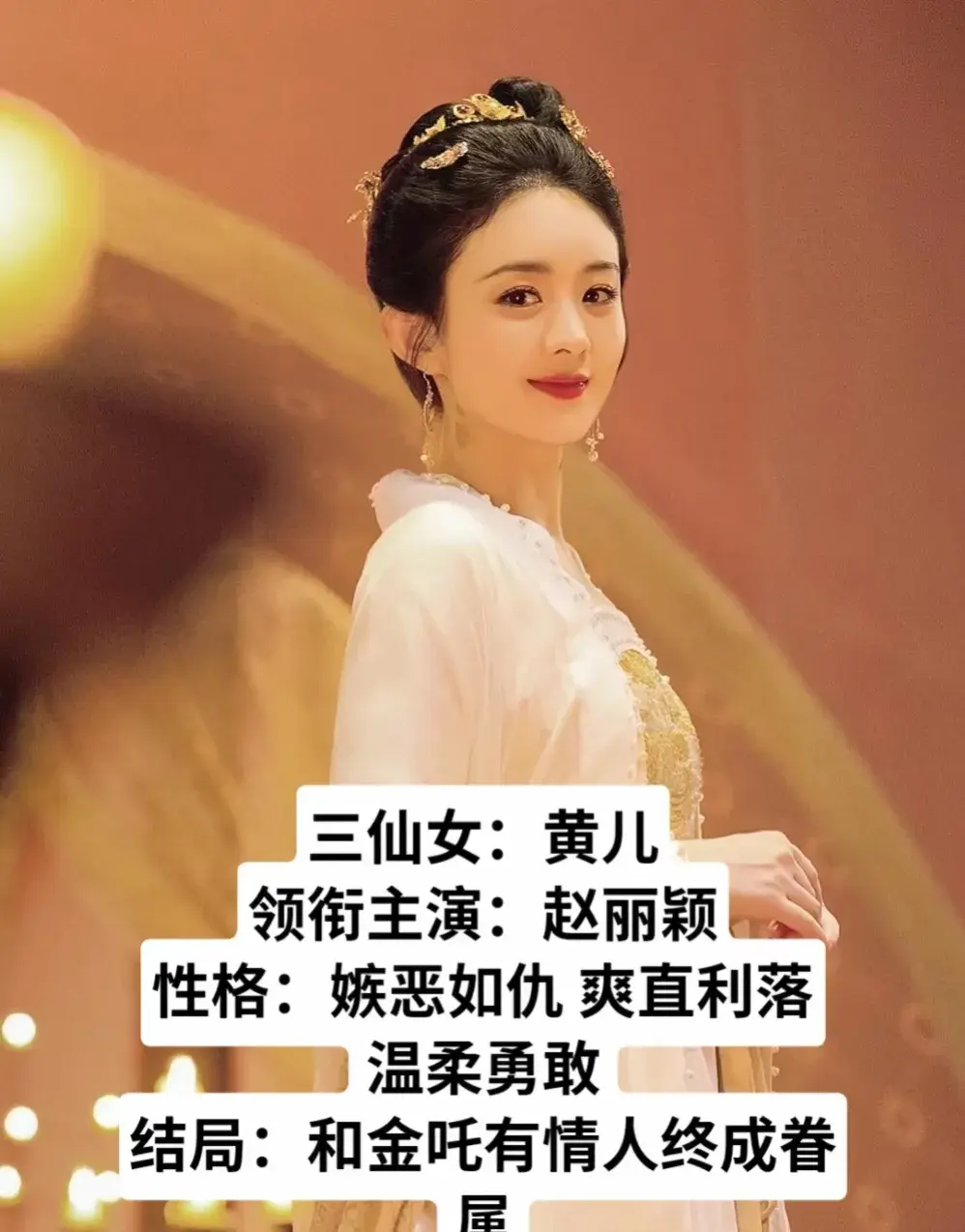 赵丽颖饰演三仙女(黄儿):嫉恶如仇、爽直利落,温柔勇敢。和金吒有情人终成眷属!