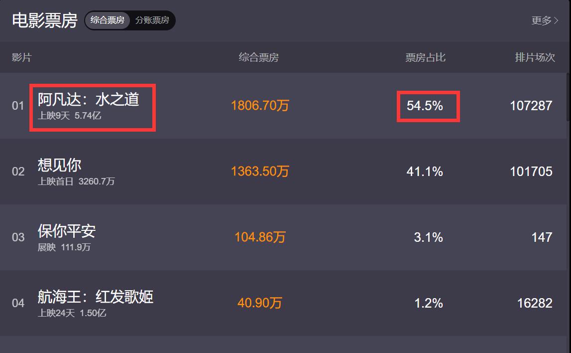 这不是我瞎说的,大家可以看一下票房成绩,累计只有少的可怜的5.74亿,放在普通电影上,这波早就成本赚回来了,可架不住这部电梯的投资摆在那里,根据可靠消息,《阿凡达:水之道》的电影投入就达到了惊人的3个亿,而且还是美元哦,不是人民币,如此巨额的投入,换回来的,却是惨不忍睹的票房,实在是扑街到了彻底的地步。
