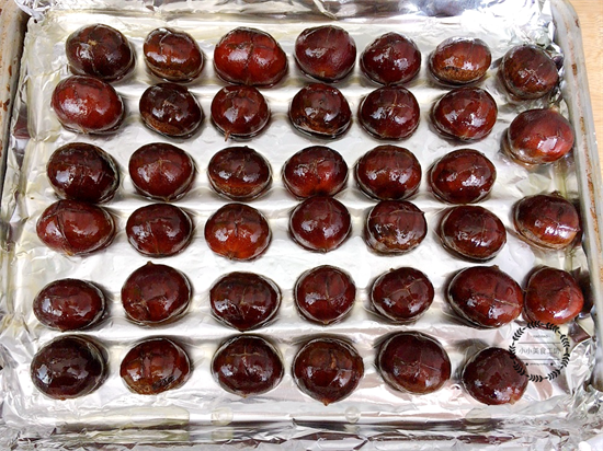 将板栗放入烤箱,220度上下火烤制20分钟即可,烤好的板栗因为高温的作用个个开口,这样不仅吃起来更省力,随着糖水的浸入,口味也更香甜。