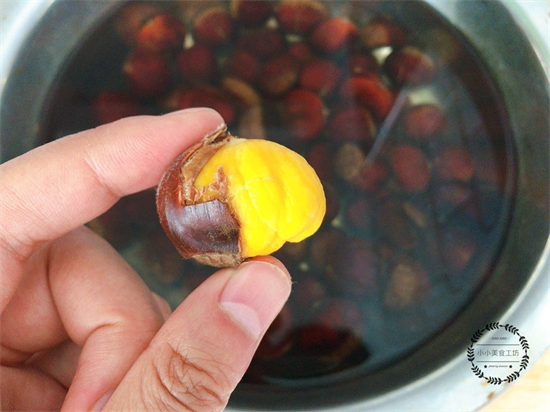 此时的板栗明显比浸泡之前的的样子鼓胀了很多,这样时候沿着切口处剥开,板栗可以连皮带壳的非常轻松地就取下来了。