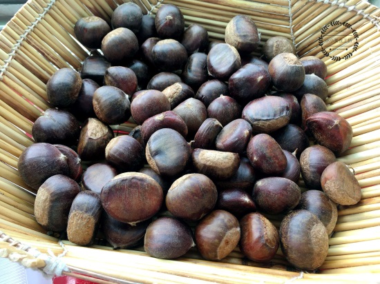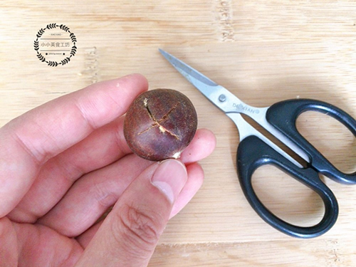 第二步:将晾晒好的板栗用剪刀划一个口子,这种方法比较快速,但切口处并不是很平整;