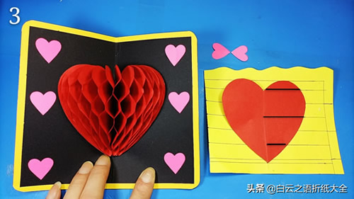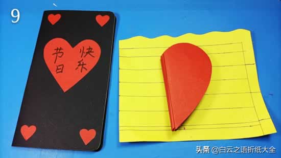步骤11:把封面翻过来覆盖上去,胶水干了以后再打开,你会惊奇地发现惊艳的爱心花朵,太漂亮了,老师收到一定非常喜欢!
