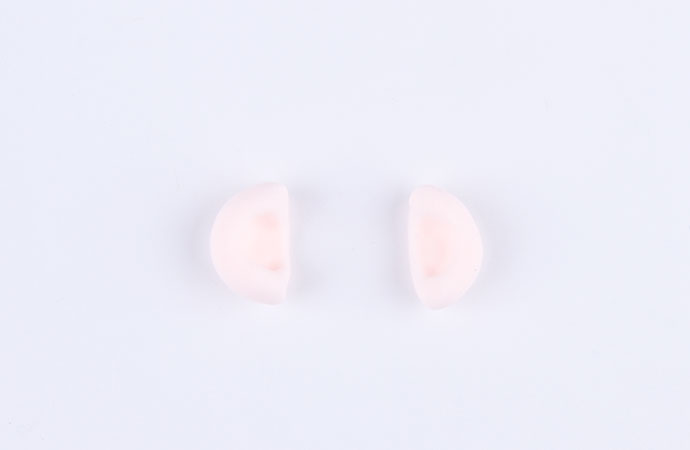 用肉色粘土做一个圆形然后从中间剪开,用工具压出小窝,这是饿狼的耳朵。