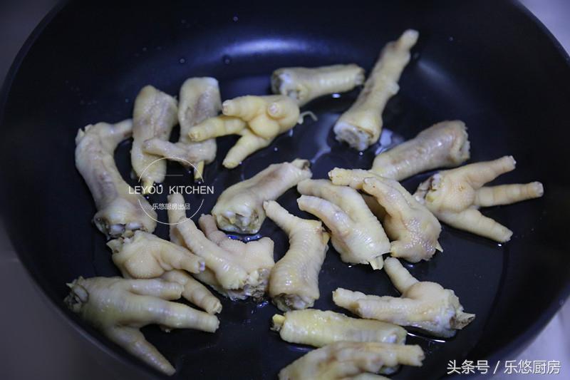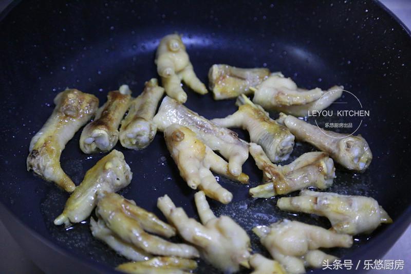 第六步:锅中倒入少许油,然后把鸡爪放入锅中,中小火开始煎制。
