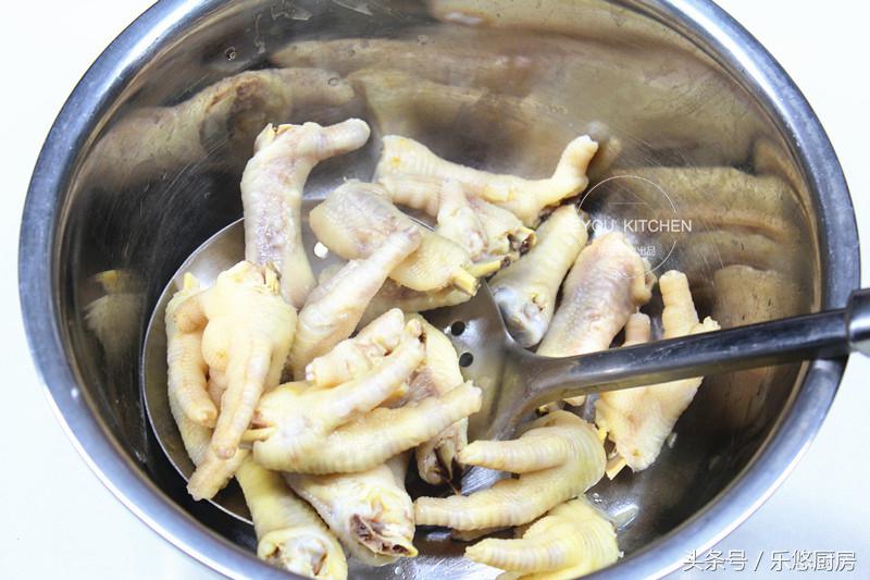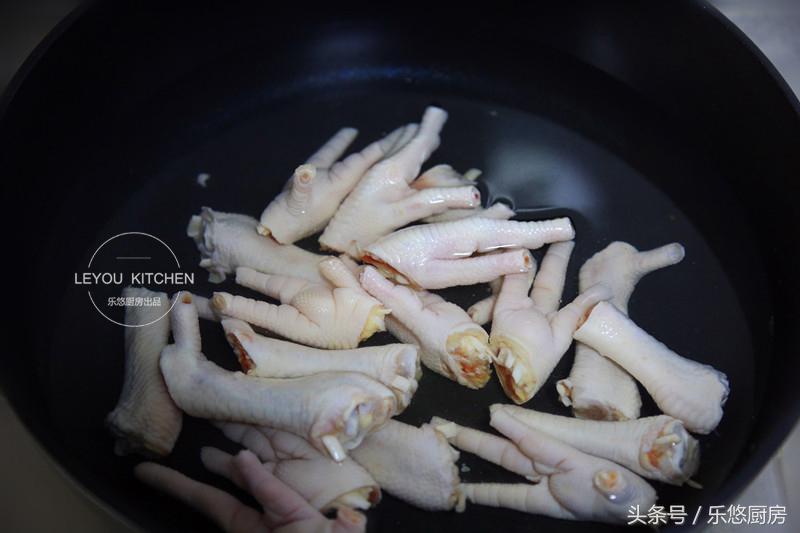 第四步:锅中倒入适量的水烧开,然后把鸡爪放入锅中,再倒入1勺料酒,大火煮3分钟后捞了放入凉水中。