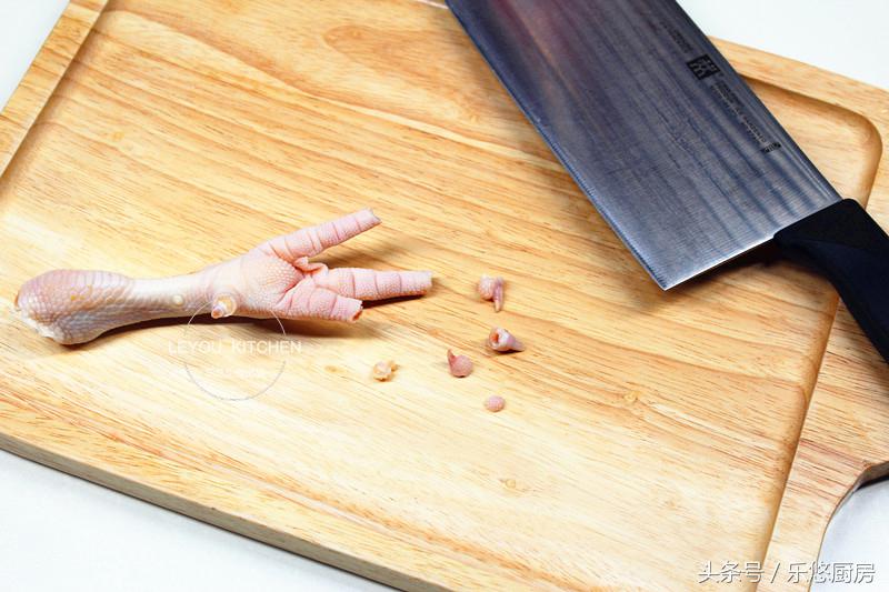 第二步:鸡爪清洗干净,去掉上面残留的干皮,然后将鸡指甲剁掉。
