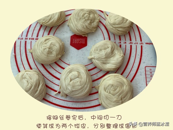 6,继续将细丝卷完后,从中间切一刀使其成为两个饼皮,分别整理成圆形