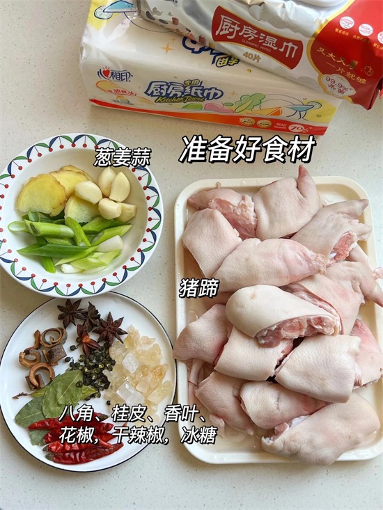 主要食材:猪蹄2个,葱姜八角大料,葱花,香叶,桂皮,花椒,冰糖,料酒,生抽,蚝油,黄豆酱,主要的食材也就这么多,做得好的猪蹄不仅好吃还很下饭,吃过一次会想第二次。