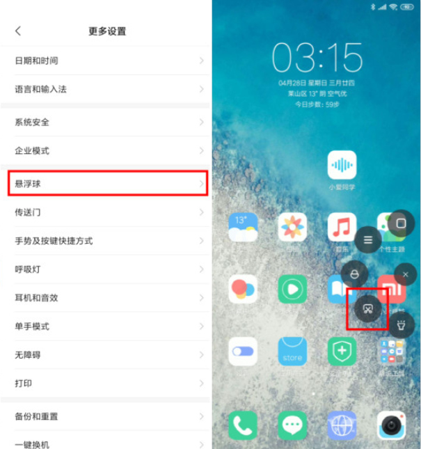小米手机桌面小圆点功能,里面可以添加很多快捷键,那么可以添加截屏操作。