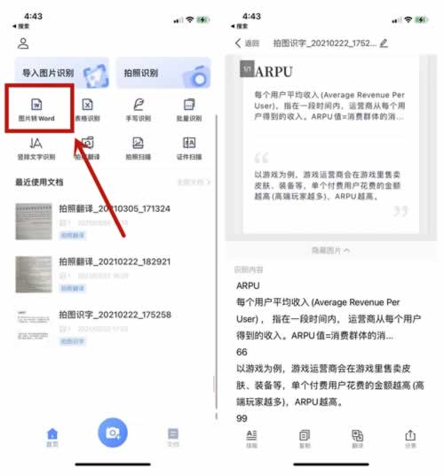 点击【迅捷文字识别】功能,选择页面图片变Word文档,这时候会自动识别截图里面的文字,然后整理成文档进行使用。