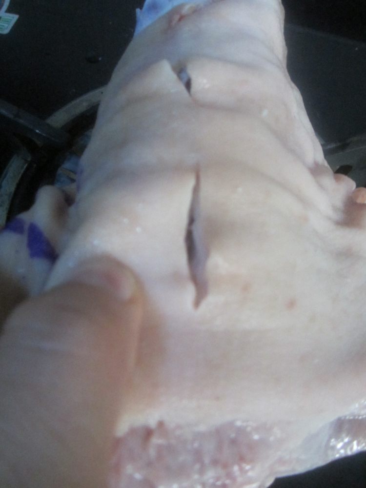 2肘子表面用刀割几个口子,便于入味,锅中倒入足量的水,待水沸腾后,放入肘子,煮4到5分钟,至表皮肉收缩,捞出,,冲去浮沫;