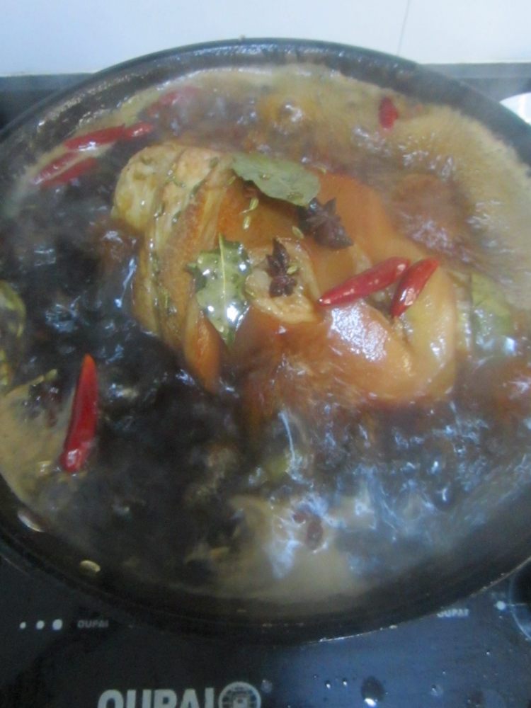 4倒入足量的水,放入八角,桂皮,小茴香,香叶,姜片,葱段,倒入生抽,老抽,料酒,加入盐,大火煮至沸腾;