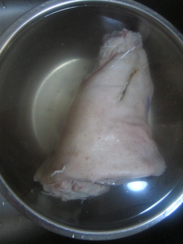 1肘子去除表面残留的细毛,清洗干净,放入水中,浸泡半小时左右;