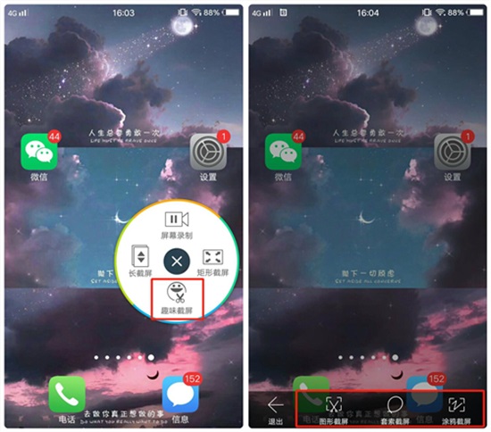 在【超级截屏】中还有一个非常好玩的【趣味截屏】功能,我们可以利用这个功能进行图形截屏、套索截屏和涂鸦截屏,非常好玩有趣。
