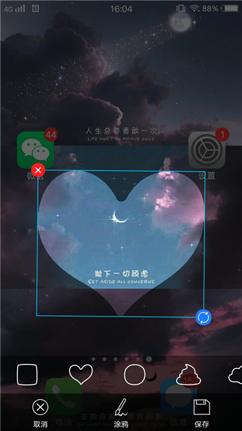 在【图形截屏】中,我们可以选择自己喜欢的图形对手机屏幕进行截屏,很是可爱。