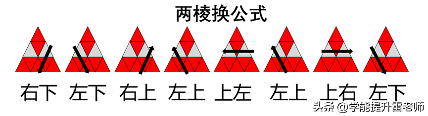 这时,观察二层棱块的颜色,判断是两个棱调换还是三个棱调换,然后通过对应公式复原。