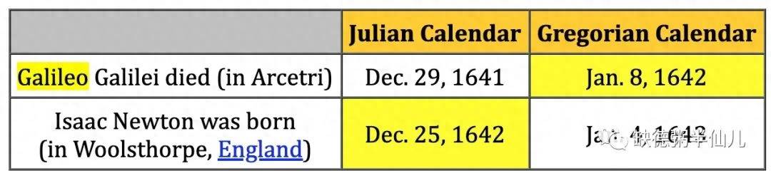 所以无论按照哪种历法,说伽利略去世和牛顿出生在同一年发生的说法是错误的。而且,准确的说牛顿在伽利略死后几乎一年(361 天)后才出生的。