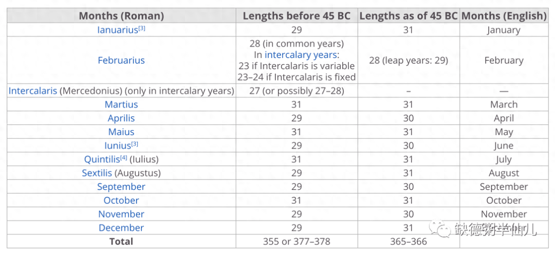 但罗马人没有遵循希腊人的通常做法,即月份交替 29 天和 30 天。公元前 5 世纪,罗马人将月份与月球周期分开,月不再以月相为参考。