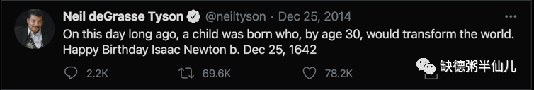 很多牛顿粉丝会在圣诞节当天在社交媒体上发文为牛爷庆生,比如美国天体物理学家 Neil Tyson 就在 2014 年圣诞节发推给牛爷庆生。