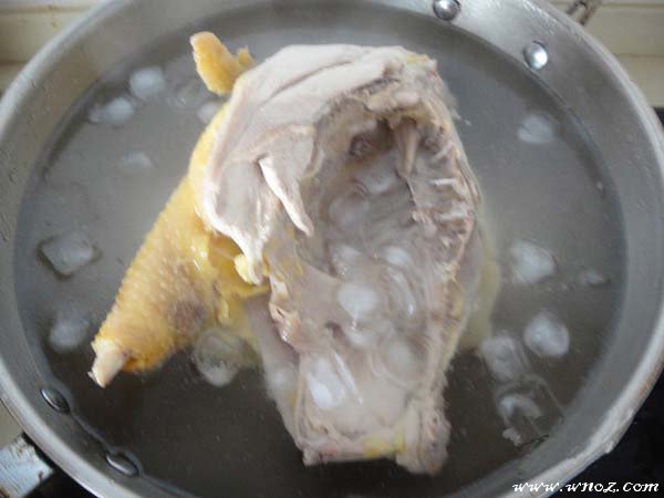 5、等鸡煮熟后要小心翼翼的把鸡肉转移到已经准备好的冰水里,不能破了鸡皮,给鸡肉来个冰水浴,这样能保证鸡皮的爽脆;