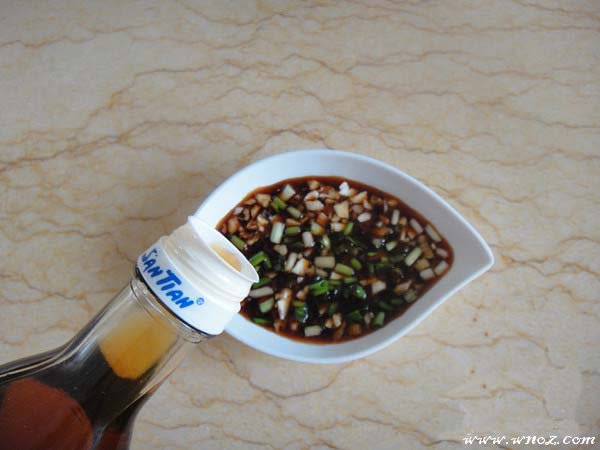 7、制作酱汁,把葱切成葱花,生姜和大蒜剁碎,然后放到小碟子里,加入适量的生抽、芝麻油和少许的白糖搅拌融化;