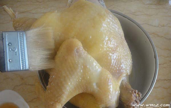 6、等鸡肉冷却后捞起来沥干,然后在鸡肉表面涂上一层芝麻油;